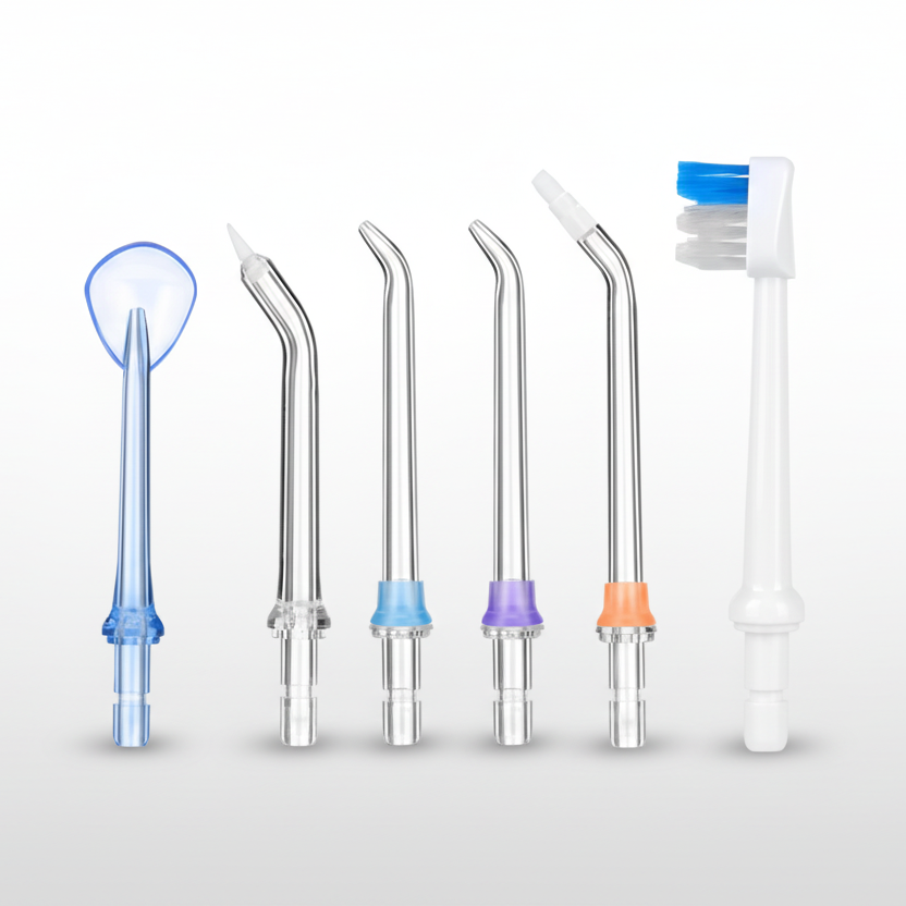 6 Multifunction Nozzles: Includes 2 Standard Tips, 1 Orthodontic Tip, 1 Periodontal Tip, 1 Tongue Cleaner, and 1 Toothbrush tip.